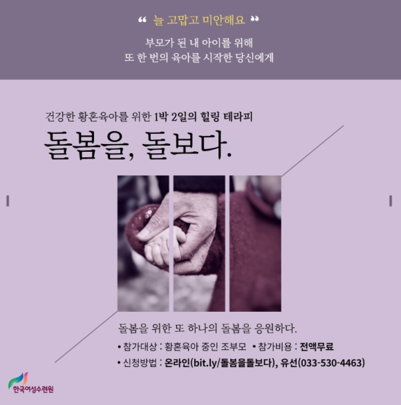 (재)한국여성수련원(원장 고창영)은 손자녀를 양육 중인 일명 할마·할빠를 위한 힐링·치유 연수‘돌봄을 돌보다’를 마련, 오는 8월 23일(수)까지 참가자를 모집한다고 밝혔다.