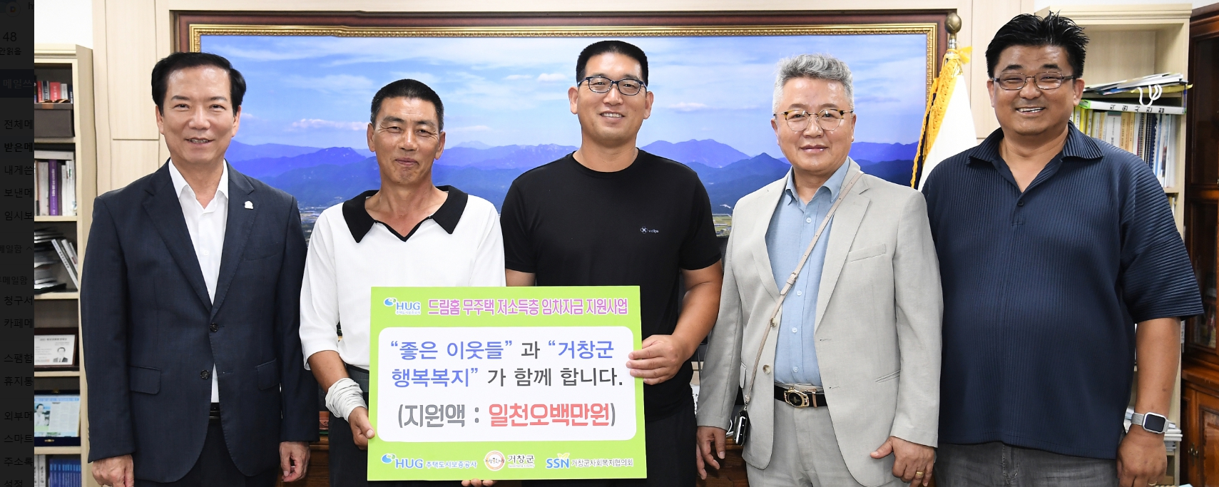 거창군과 거창군사회복지협의회(회장 임규순)는 지난 9일 군수실에서 관내 무주택 저소득층 3가구에 ‘HUG 드림홈 지원사업’ 임차보증금 1,500만 원을 지원하는 전달식을 개최했다. 전달식에는 구인모 군수, 임차보증금 지원 대상자와 사업의 신청부터 최종 선정까지 애써 온 임규순 거창군사회복지협의회장을 비롯한 협의회 관계자 등이 참석했다.