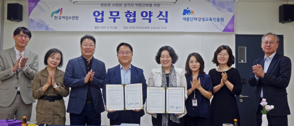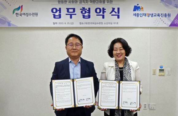 (재)한국여성수련원 ↔ (재)세종인재평생교육진흥원 평등한 사회와 공직자 역량강화 위한 업무협약 체결▶ 8월 25일(금) 9시 30분, (재)한국여성수련원에서 업무 협약식 개최▶ 양 기관 상호협력 통한 평등한 사회를 향한 공직자 역량강화 교육 발전 목적 ▶ 정보 및 인·물적자원 교류 등 공동 발전 도모 약속 정유근 기자 / |