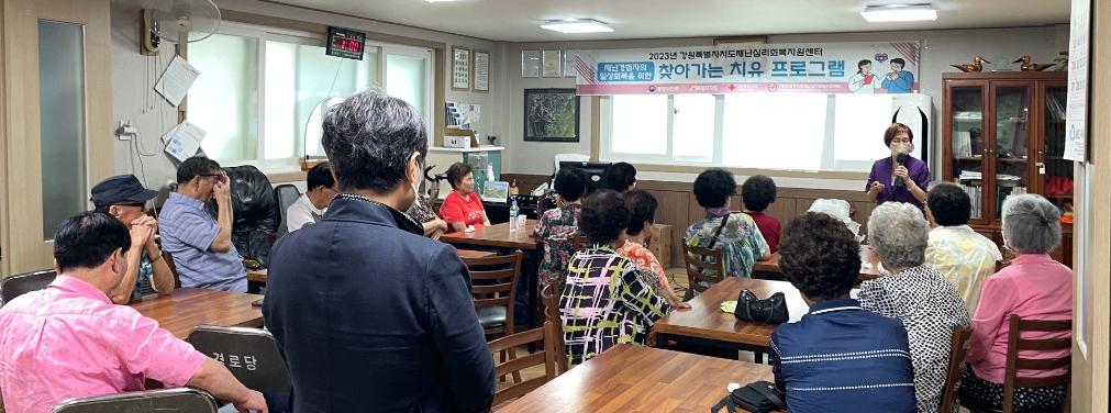 이번 마음구호 프로그램 사업은 도 재난심리회복지원센터(대한적십자사 강원특별자치도지사)와 협력하여 강릉 저동 현대아파트 경로당에서 지난 4월 산불 피해 경험자 100여명을 대상으로 총 5회에 걸쳐, 행정안전부 마음구호 프로그램 교육을 이수한 전문 강사들이 참여하여 진행하고 있다.