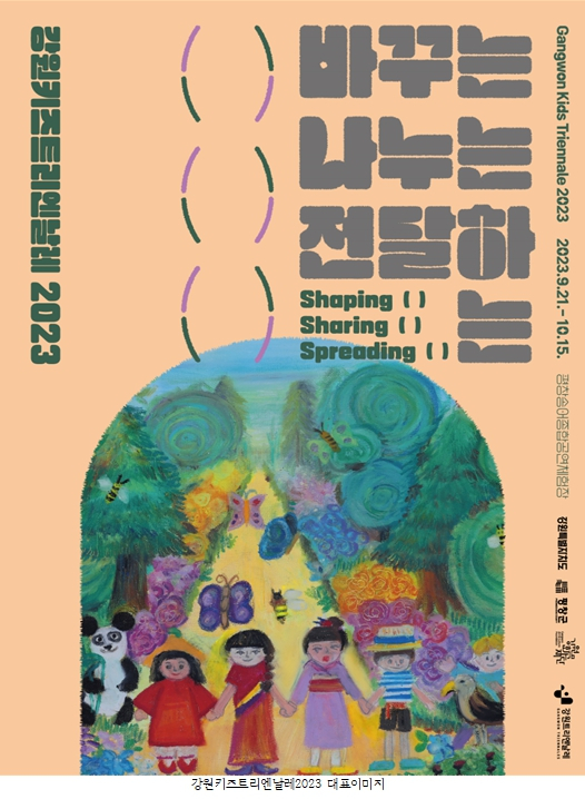 강원키즈트리엔날레2023의 주제 ‘( ) 바꾸는 ( ) 나누는 ( ) 전달하는 : Shaping ( ) Sharing ( ) Spreading ( )’은 어린이 큐레이터단이 오랜 숙고를 통하여 직접 도출한 주제이다. 바꾸고, 나누며, 전달하는 행위는 그 자체로 변화와 공유의 이야기를 담고 있으며, ‘괄호( )’가 주는 비어있음으로 무한한 확장과 자율의 의미를 지닌다.