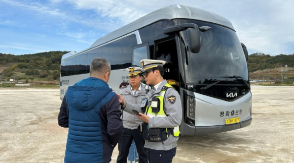 함양경찰서(서장 김현환)에서는 11. 10.(금) 함양 상림공원 주차장 일원에서 가을 행락철 전세버스 현장점검을 실시하였다. 이번 점검은 함양경찰서와 함양군청 합동으로 가을 행락철 전세버스 이용량 증가에 따른 대형 사고를 예방하기 위해 전세버스 차량 안전사항에 대한 ▲ 음주운전 여부 ▲ 운전자 자격여부 ▲ 속도제한장치 정상유무 등을 집중적으로 점검하였으며 운행 중 휴대폰 사용금지, 음주운전 금지 등 교통법규 준수사항에 대한 내용을 홍보ㆍ전파하여 교통사고 예방을 위해 점검을 하였다.