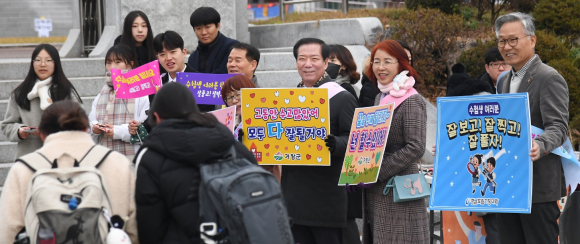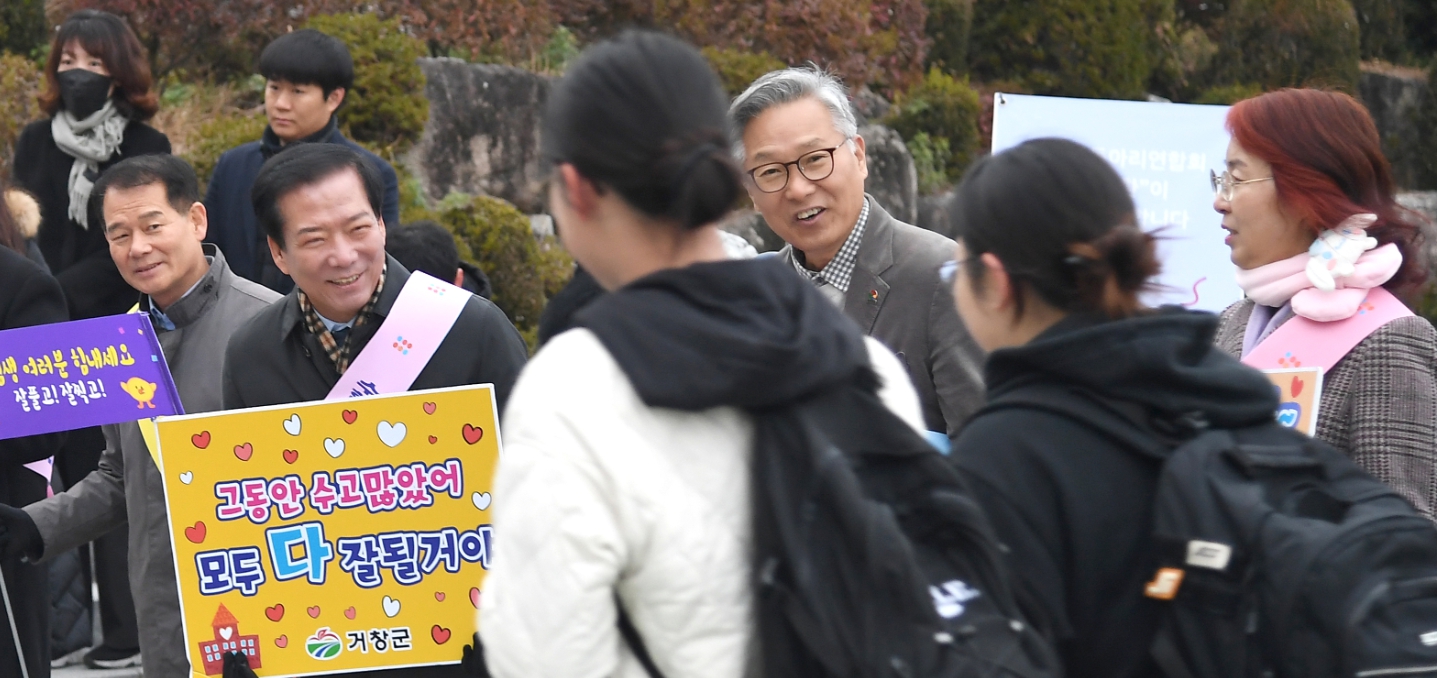구인모 거창군수, 2024년도 대입 수능 시험장 현장 응원어깨띠와 손 현수막으로 수험생 응원이광훈 기자 / |