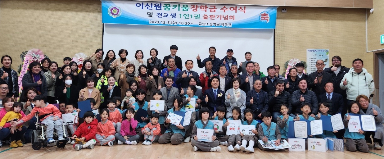 함양 금반초등학교(교장 백종필)가 각종 교육활동 대회에 참가하여 교육감상 이상을 수상한 학생에게 장학금을 전달하는 ‘2023. 이신원 꿈키움 장학금 수여식’과 전교생 모두가 1인1권 출판을 기념하는 ‘전교생 1인1권 출판회’를 5일 학교 강당에서 교육장, 의회의장, 유관기관장, 지역민 등 150여명이 참여한 가운데 축하를 받으며 가져 주변으로부터 큰 부러움을 샀다.