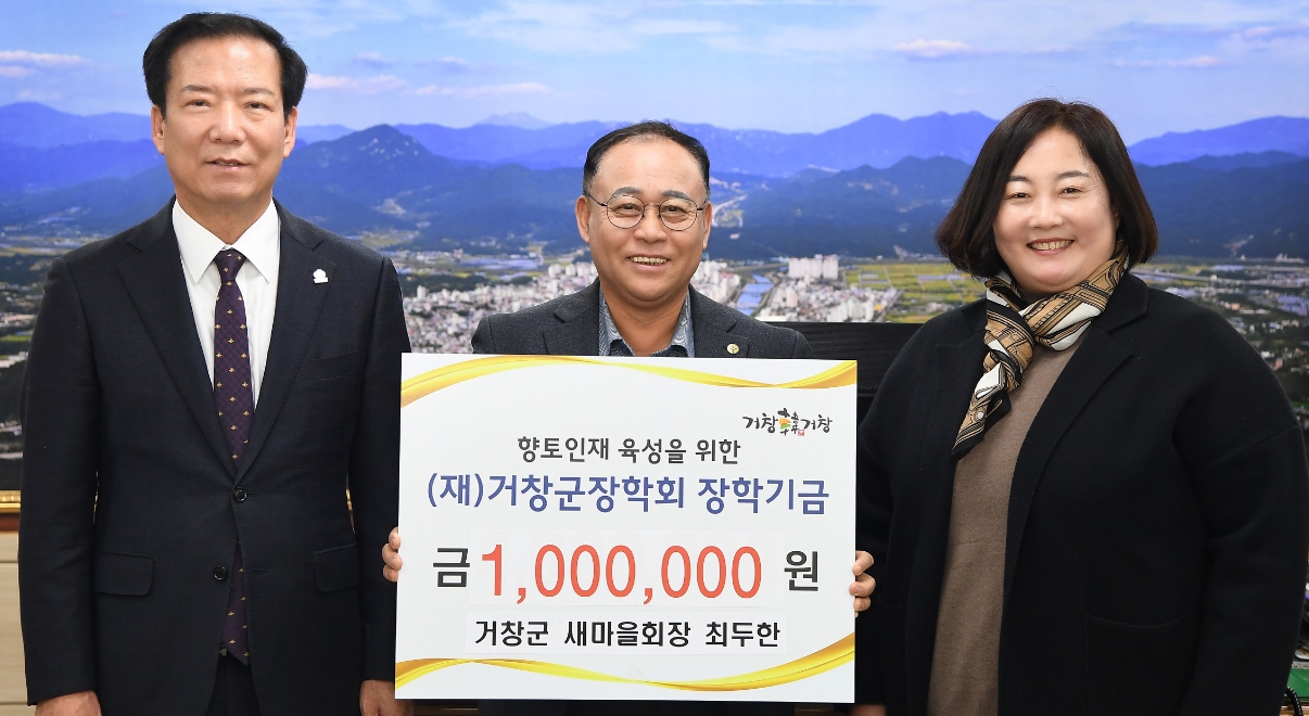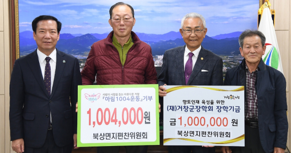 (재)거창군장학회(이사장 구인모 거창군수)는 지난 8일 최두한 거창군새마을회장이 장학금 100만 원, 임영선 북상노인회 분회장이 장학금 100만 원, 북상면지편찬위원회(위원장 임영선)가 장학금 100만 원과 아림1004운동 100만 4,000원, 정성철 거함종합건설(주) 대표가 장학금 100만 원을 기탁했다고 밝혔다.