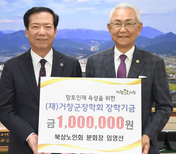 임영선 북상노인회 분회장은 지난 2019년 장학금 150만 원, 2020년 장학금 100만 원, 북상초등학교에 37년째 매년 장학금 100만 원을 기탁하고 있으며, 이날 기탁식에서 “거창군의 청소년들이 미래의 꿈과 희망을 실현해 나가는 데 조금이나마 도움이 되길 바란다”라고 말했다.