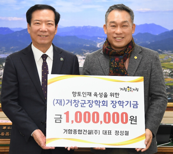 정성철 거함종합건설(주) 대표는 지난 2022년 도립거창대학에 100만 원, 마리면 공유냉장고에 50만 원 상당 물품과 2023년 70만 원 상당 식품을 기탁했으며, 이날 기탁식에서 “거창군 교육발전에 보탬이 되길 바라며, 지역의 우수학생과 가정형편이 어려운 학생들에게 희망이 됐으면 좋겠다”라고 말했다.