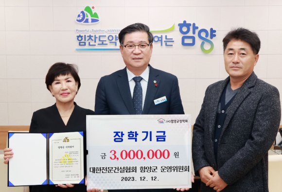 함양군장학회, 따듯한 기탁행렬 잇따라12일 함양군 여성단체협의회·대한전문건설협회 각각 300만원 장학금 쾌척정호 기자 / |