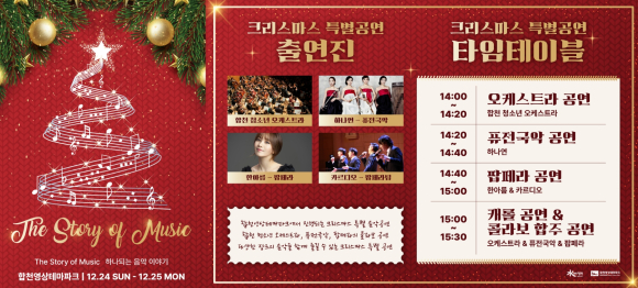 합천군(군수 김윤철)은 계획공모형 지역관광 개발사업인 ‘리멤버 합천영상테마파크 사업’의 일환으로 합천영상테마파크에 크리스마스 특별공연 ‘The Story Of Music’(하나되는 음악 이야기)을 개최한다고 18일 밝혔다. 특별공연은 크리스마스 시즌을 맞아 12월 24일부터 25일까지 2일 간 오후 2시부터 1시간 30분동안 합천영상테마파크 단성사 무대에서 진행된다. 크리스마스 동안 영상테마파크를 찾는 관람객들에게 감성과 힐링을 더할 다양한 음악 장르의 공연을 제공할 예정이다.