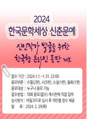 한국문학세상, ‘2024 종이없는 신춘문에’ 1월 1일부터 온라인 접수종이없는 신춘문예로 온라인 비밀코드 심사최고 득점자 당선자 결정하는 한국형 등단제도 김철상 기자 / |