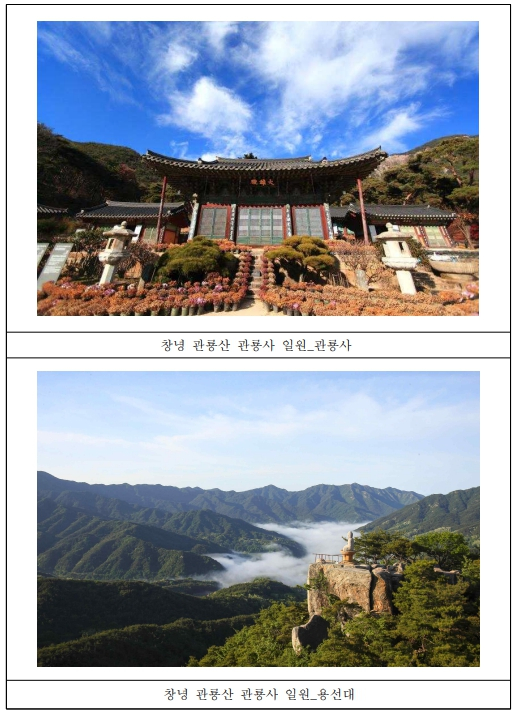 이외에 이번에 명승으로 지정된 「창녕 관룡산 관룡사 일원」은 신라시대 고찰로 알려진 관룡사와 그 뒤쪽에 병풍처럼 둘러진 기암괴석의 산봉우리 등 산세가 어우러져 수려한 경관을 이루고 있다. 또한 반야의 세계로 향하는 용이 이끄는 배라는 뜻의 ‘반야용선(般若龍船)’을 재현한 듯한 불상인 용선대(龍船臺)와 관룡사의 많은 불교문화유산이 자연과 서로 조화를 이루는 곳이다. * 반야: 불교의 근본교리 중 하나로 인간이 진실한 생명을 깨달았을 때 나타나는 근원적인 지혜