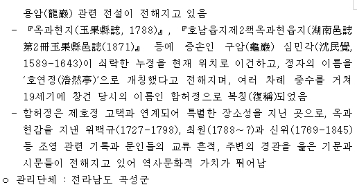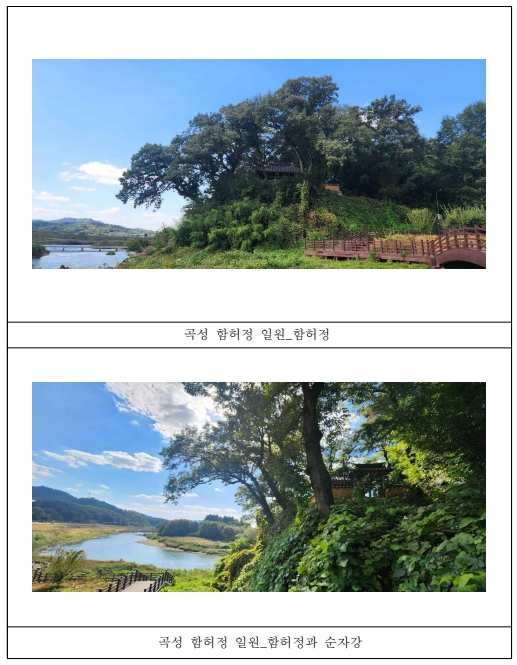 | 명승으로 같이 지정된 「곡성 함허정 일원」의 함허정은 조선 중기 문사(文士) 제호정(齊湖亭) 심광형(沈光亨, 1510-1550)이 섬진강(순자강) 일대 구릉지에 건립한 정자이다. 국가민속문화유산 「곡성 제호정 고택」과 인접한 곳으로, 정자의 조영 기록과 문인들의 교류 흔적, 주변의 경관을 읊은 기문과 시문들이 전해지고 있어 역사·문화적 가치가 뛰어나다. 함허정 일대는 풍수상 거북이가 용궁을 향해 입수하는 형국으로, 거북이의 등 위에 함허정(涵虛亭)이 자리하고 절벽 아래의 깊은 웅덩이인 용소(龍沼)와 구암조대(龜巖釣臺)라 불리는 하중암도가 있으며, 거꾸로 ‘용(龍)’자를 새긴 용암(龍巖) 관련 전설이 전해지고 있다. * 조대(釣臺) : 낚시질 하는 곳 * 하중암도(河中巖島) : 강 속에 섬처럼 떠 있는 암반
