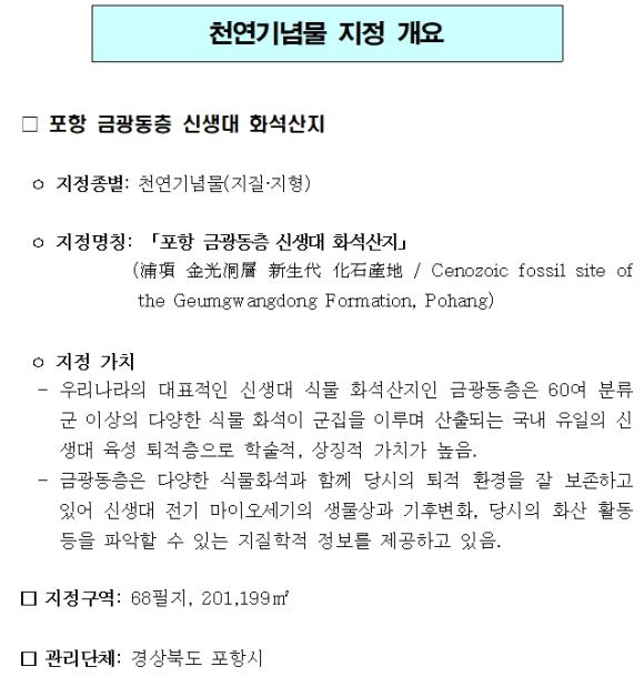 「포항 금광동층 신생대 화석산지」는 메타세쿼이아, 너도밤나무, 참나무, 자작나무 등과 각종 미기록 종을 포함해 식물화석이 60여 종이 넘게 나온 곳이고, 우리나라 내륙에서 발견되지 않는 식물화석도 발견된 바 있어 한반도 신생대 전기의 지형과 기후환경, 식생 변화 등을 예측할 수 있는 중요자료이다.