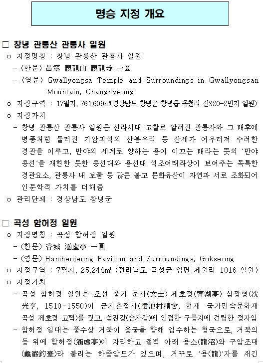 - 「포항 금광동층 신생대 화석산지」(천연기념물), 60여 종 이상의 식물화석 발견된 뛰어난 학술적 가치 인정 - 수려한 경관의 「창녕 관룡산 관룡사 일원」과 섬진강 인근의 「곡성 함허정 일원」(명승), 역사문화적 가치 인정