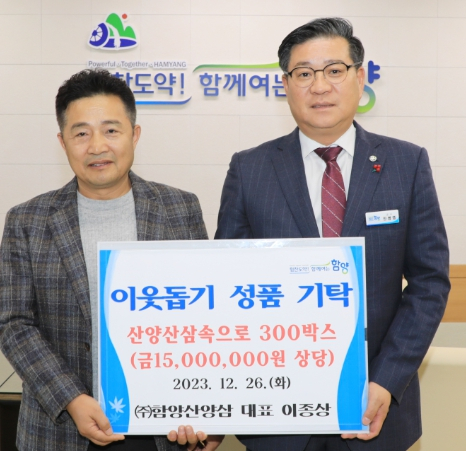 함양군, 따뜻한 나눔의 온정 릴레이㈜함양산양삼 이종상 대표 ‘산양삼속으로’ 300박스, 인월면 시장식당 100만원 기탁정호 기자 / |