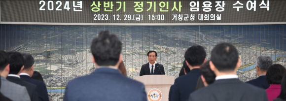 | 구인모 거창군수는 2024년 상반기 정기인사 임용식에서 “중요한 것은 과거의 과오에 대해 연연하지 않고 지금부터 자신의 위치에서 성과를 창출하고 군민의 봉사자로서 역할을 다하는 것이다”라며 “더욱 성숙한 모습으로 새롭게 각오를 다지며 군정에 더 많은 힘을 보태주시길 바란다”라고 당부했다. |