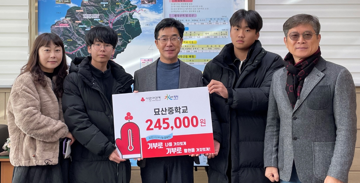 합천군 묘산중학교(교장 조성래) 비즈쿨동아리 학생들은 지난달 28일 묘산면사무소(면장 한호상)를 방문해 관내 어려운 이웃들이 조금이라도 따뜻한 겨울을 보낼 수 있도록 써달라며 ‘비즈쿨데이 비즈마켓 축제’를 개최해 얻은 수익금 245,000원을 기부했다.