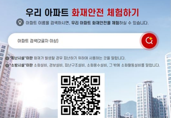 ‘우리 아파트 화재안전 체험하기’ 누리집에 접속(사진의 QR코드 활용)하여 아파트 이름 또는 주소를 입력하면 아파트 전경, 옥상 형태, 옥상 출입문 위치, 피난기구, 옥내소화전, 스프링클러설비 등 피난·소방시설 설치 현황을 실제 촬영 사진으로 확인할 수 있으며, 사용법 교육 영상 시청도 가능하다.