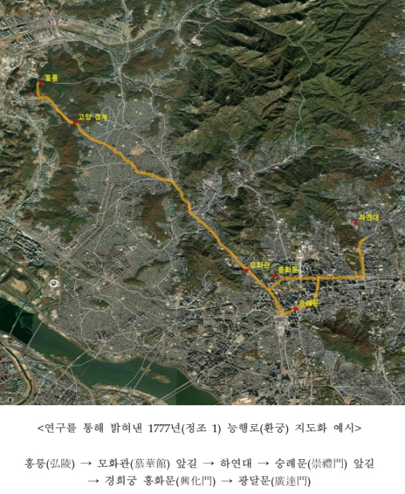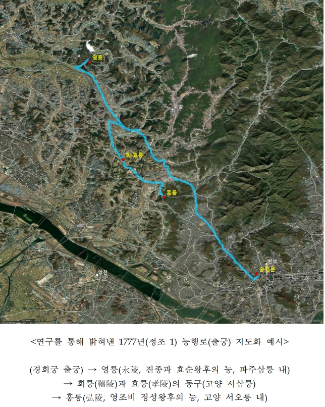 마지막으로 위와 같은 분석을 기반으로 능행 경로를 추출하고, 조선시대 도로망을 바탕으로 한 지리정보시스템(GIS) 프로그램을 활용하여 궁궐에서 왕릉을 오가는 왕복 경로도 지도상에 시각화하였다. 이는 향후 능행 행렬 재현 등 궁능 활용 콘텐츠 개발에 활용될 수 있을 것으로 기대된다.