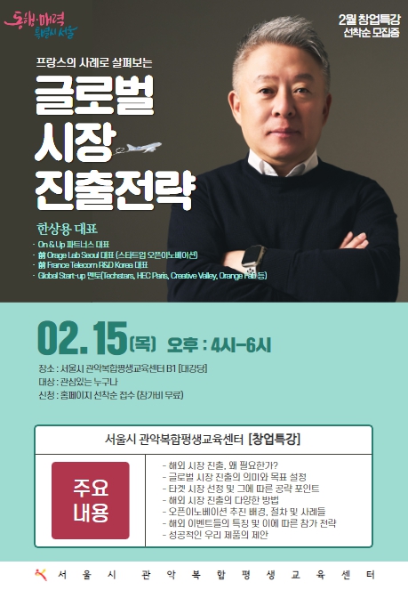 | 글로벌 창업 특강 강사는 한상용 온앤업 파트너스(on&up partners)대표로서, 글로벌 제품/사업 전략 컨설팅을 하고 있으며 프랑스 텔레콤 알앤디 코리아(France Telecom R&D Korea)대표, 글로벌 스타트업(Global Start-up) 기관의 멘토로서 (Techstars, HEC Paris, Creative Valley, Orange Fab, 한양대학교)에서 활동하였다. 벤처스퀘어 투자 및 글로벌 파트너, 컴업(ComeUp) 2023 글로벌 분과 자문 위원 등으로 다양한 경험을 가지고 있다. 그리고 SBS CNBC 미리보기 스타트업 프로그램 글로벌 시장진출 멘토로 출연하고 경기도 경제과학진흥원의 프랑스 Vivatech 2023 연계 과제 수행, 농식품 스타트업 글로벌 시장 진출 전략 강연, 콘텐츠 스타트업 글로벌 시장 진출 전략 강연, 메타버스랩 스타트업 글로벌 진출 컨설팅 및 글로벌 멘토 연계, 대학 실험실 창업 스타트업 슬러시 2023 참가 멘토링을 하였다. 서울시 관악복합평생교육센터는 2022년 11월 1일에 개관하여 운영중이며 시민 대상층별 커리어 강화를 위한 취·창업 프로그램 개발, 학습 문화 구축을 위한 평생교육 프로그램의 다양화. 청년 창업의 인큐베이팅 거점 시설로의 역할 확대, 창업 프로그램 운영 및 대관시설 제공을 하고 있다. 신청은 무료이며 서울시 관악복합평생교육센터 홈페이지를 참조하면 된다. |