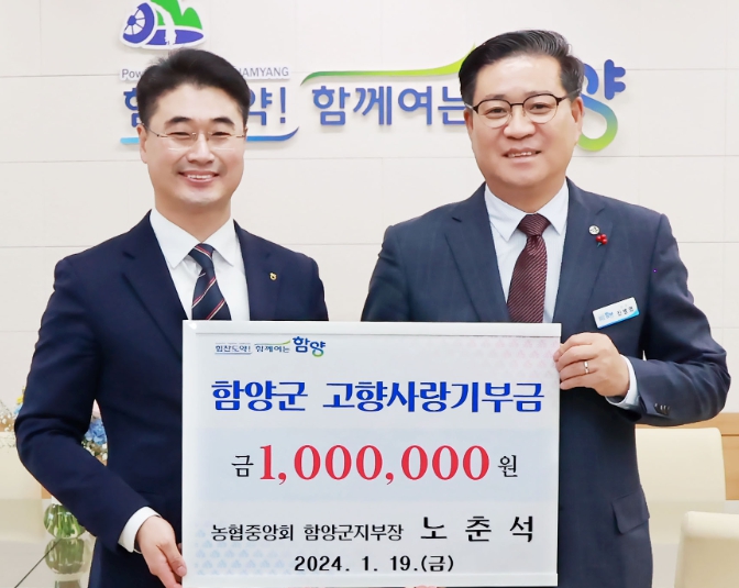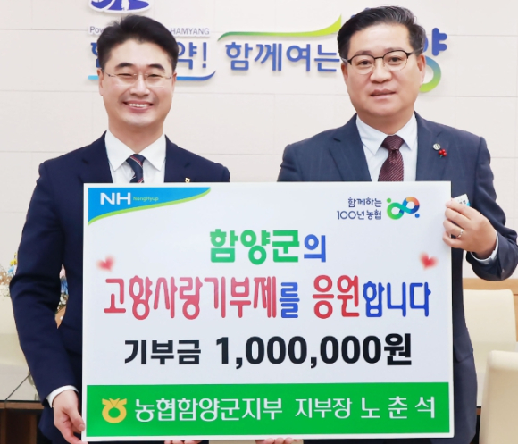 노춘석 농협중앙회 함양군지부장, 함양군 고향사랑기부제 동참19일 고향사랑기부금 1백만원 전달, 제2의 고향 함양 발전 응원정호 기자 / |