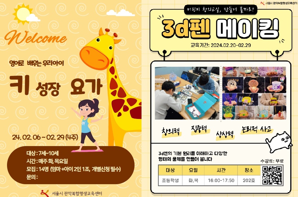 서울시 관악복합평생교육센터, 키 성장 요가, 3d펜 메이킹 어린이 강좌 2월 오픈- 신청은 무료, 서울시 관악복합평생교육센터 홈페이지 참조한용택 기자 / |