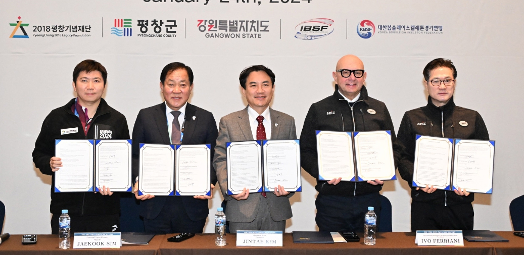 평창군은 국제봅슬레이스켈레톤연맹(IBSF), 강원특별자치도, 2018평창기념재단 (사)대한봅슬레이스켈레톤경기연맹과 함께 1월 24일(수) 대관령면 알펜시아 컨벤션센터 대관령 2홀에서 평창 올림픽 슬라이딩센터 국제기구 및 국제대회 유치를 위한 관계기관 업무협약을 맺었다.