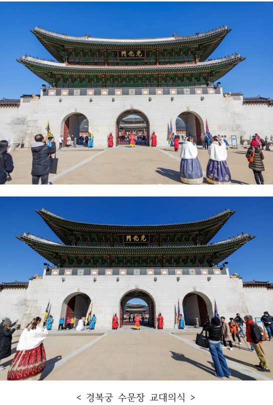 2월 9일부터 12일까지 경복궁 광화문 일대에서는 궁궐의 문을 지키는 수문장과 수문군들의 근무 교대를 재현하는 ‘수문장 교대의식’이 1일 2회(오전 10시, 오후 2시) 진행된다. ‘수문장 교대의식’은 국민 누구나 무료로 관람이 가능하며, 행사와 관련된 자세한 문의는 한국문화재재단 활용기획팀(☎02-3210-1645)으로 하면 된다.