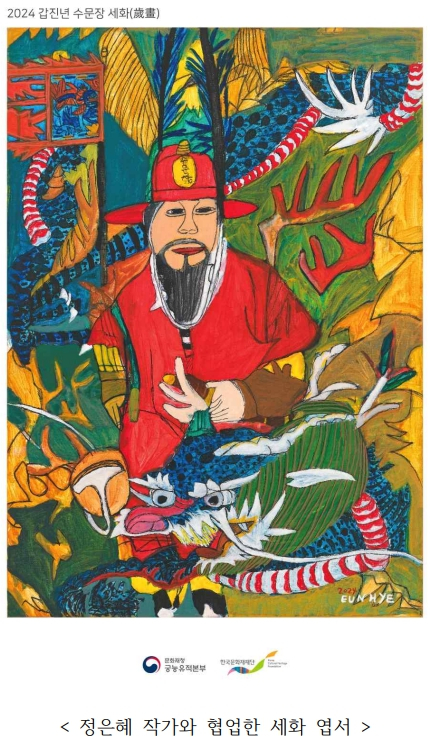 올해 세화는, 풍자화(캐리커처) 작가이자 2022년 tvN 드라마 ‘우리들의 블루스’에 출연하며 배우로도 활동하고 있는 정은혜 작가와 협업한 ‘청룡을 배경으로 서있는 수문장’ 그림으로 회당 선착순 배포되며, 한국문화재재단 누리집(www.chf.or.kr)에 접속하거나 행사 현장에서 정보 무늬(QR코드)를 통해 내려받을 수도 있다. 자세한 사항은 한국문화재재단 활용기획팀(☎02-3210-1645/1646)으로 문의하면 된다.
