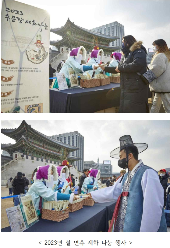 | 또한, 궁능유적본부는 한국문화재재단(이사장 최영창)과 함께 설 연휴기간 경복궁 광화문 일대에서 국가유산 활용 행사를 개최한다.