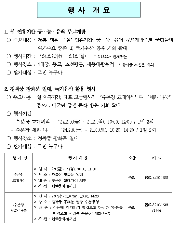 - 4대궁, 종묘, 조선왕릉 및 세종대왕유적 무료개방(2.9.~2.12./창덕궁 후원 제외) - ‘수문장 교대의식’(2.9.~2.12.) 및 ‘우리들의 블루스’ 정은혜 작가와 협업한 세화 선착순 나눔(2.9.~2.10.)