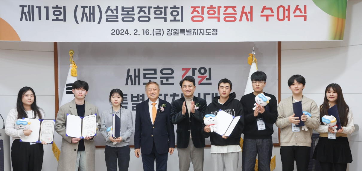 강원특별자치도와 (재)설봉장학회는 2. 16.(금) 14시, 강원특별자치도청에서 후원 협약을 체결하고 제11회 (재)설봉장학회 장학증서 수여식 행사를 개최했다.