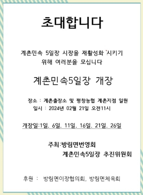 2월 21일 수요일, 방림면 계촌민속5일장이 20여 년 만에 재개장한다. 지역 주민들은 지역 경제를 살리고 주민들에게 옛 향수를 되살려 주기 위해‘계촌민속5일장추진위원회(회장 주국창)'를 꾸리고 5일장 살리기에 힘을 쏟은 끝에 방림면 번영회, 이장협의회, 체육회 및 지역 상인 등의 협조를 얻어 오는 21일 개장식을 가진다.