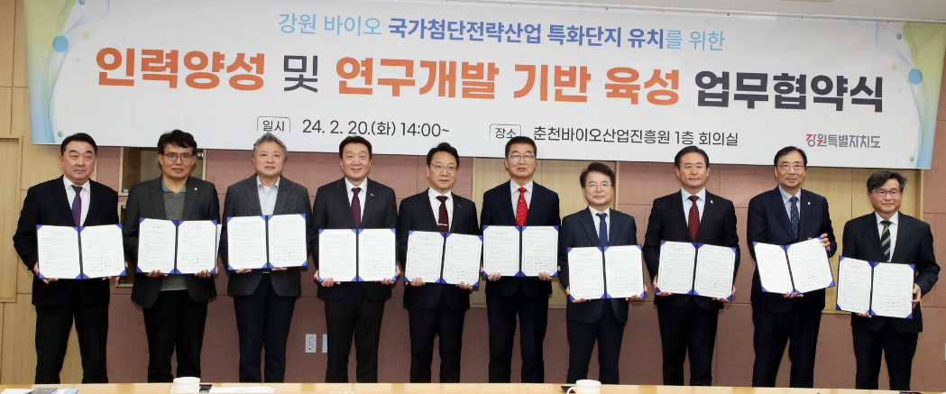 강원특별자치도는 2월 20일(화) 도내 주요 대학 및 기관과 강원 바이오 국가첨단전략산업 특화단지 유치를 위한 「인력양성과 연구개발 기반 육성을 위한 업무협약식」을 개최했다고 밝혔다.
