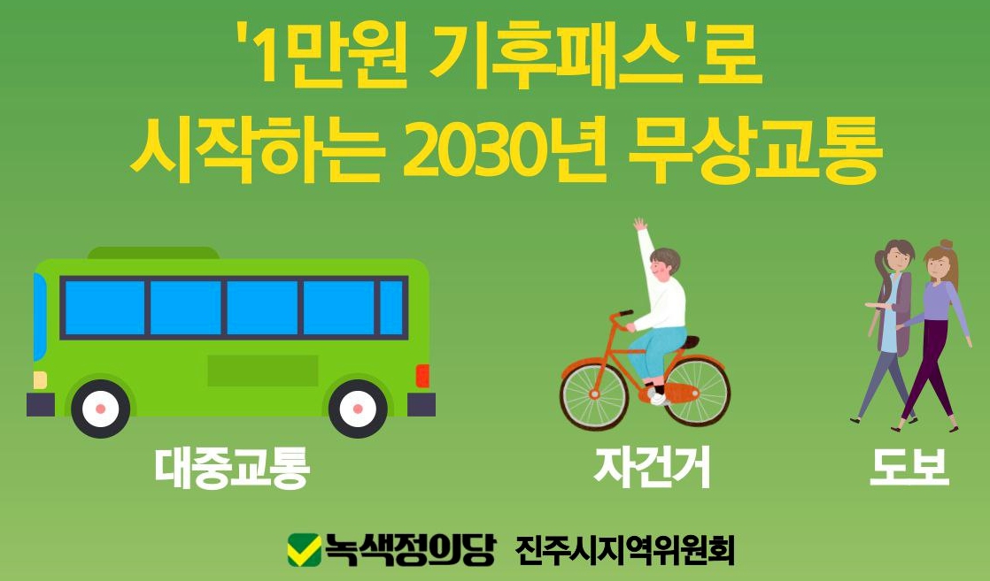 첫째, 2030년 무상교통으로 향하는 ‘1만원 기후패스’를 도입하겠습니다. 최근 공공교통의 필요성에 대한 관심이 뜨겁습니다. 녹색정의당 진주시지역위원회는 <2030년 무상교통 계획>을 수립하고, 2030년까지 단계적인 무상교통을 달성하겠습니다.