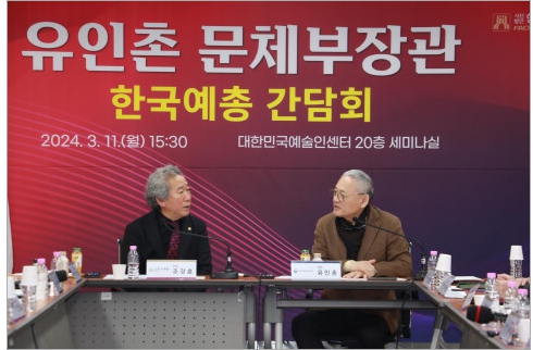 2024년 3월 12일 -- 한국예술문화단체총연합회(이하 한국예총) 조강훈 회장과 문화체육관광부 유인촌 장관은 3월 11일(월) 대한민국예술인센터에서 한국예총 10개 회원협회 이사장과 16개 광역시도 연합회 회장 등 30여명이 참석한 가운데 문화예술인 현장 간담회를 개최했다.