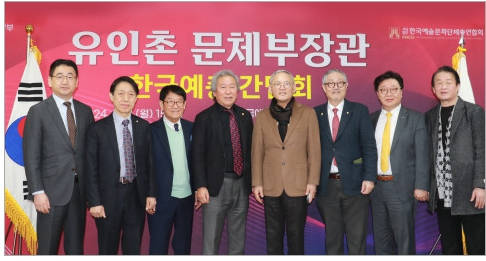 | 한국예총 측은 이번 간담회는 2011년 대한민국예술인센터 건립 이후 처음으로 문체부 장관이 한국예총을 공식적으로 방문해 예총 대표자들과 간담회를 개최한 것이라 더욱 의미가 깊다며, 유인촌 장관은 예정된 시간보다 두 배 이상 시간을 할애하면서 한국예총의 당면한 문제와 현안 등에 대해 심도 있게 해결 방안을 모색했다고 밝혔다. 한국예술문화단체총연합회 소개 한국예술문화단체총연합회는 예술 문화의 교류 촉진과 예술인 권익 신장을 목적으로 1961년에 설립된 국내 최대 규모 비영리 사단법인이다. 건축, 국악, 문인, 연예, 연극, 영화, 음악, 미술, 사진, 무용 10개 회원 협회와 전국 시·도 172개 연합회 및 지회로 구성돼 있다. 대한민국예술인센터를 중심으로 축제·공연·전시 등 다양한 문화 예술 콘텐츠를 확산해 나가고 있으며, 예술가와 향유자 모두 행복한 문화 예술을 추구한다. |