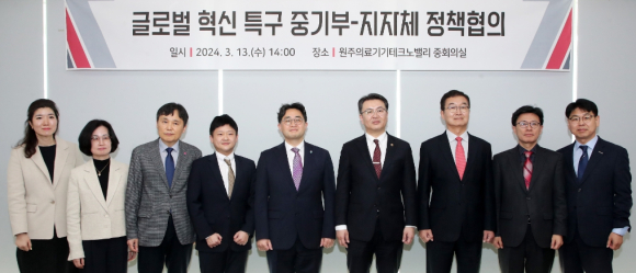 강원특별자치도는 3월 13일(수), 원주의료기기테크노밸리에서 글로벌 혁신 특구의 성과를 극대화하기 위한 중소벤처기업부-지방자치단체 정책협의회를 개최했다고 밝혔다.