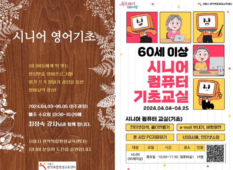 서울시 관악복합평생교육센터 시니어 영어기초반, 컴퓨터 기초교실 무료 개강