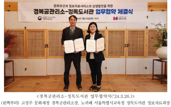 | 한편, 앞서 지난 26일 경복궁관리소는 서울특별시교육청정독도서관과 ▲ 도서 지원 및 추천(큐레이션), ▲ 집옥재 내부공간 활용 상담, ▲ 집옥재 활용 문화행사 등의 추진을 위한 업무협약을 체결하고, 신간도서 등 150여 권을 대여·기증받았다. 이를 바탕으로 올해 집옥재에서 다양한 활용 프로그램을 선보일 계획이다. * 활용 프로그램의 세부 내용은 향후 궁능유적본부 통합 누리집에 공개 예정
