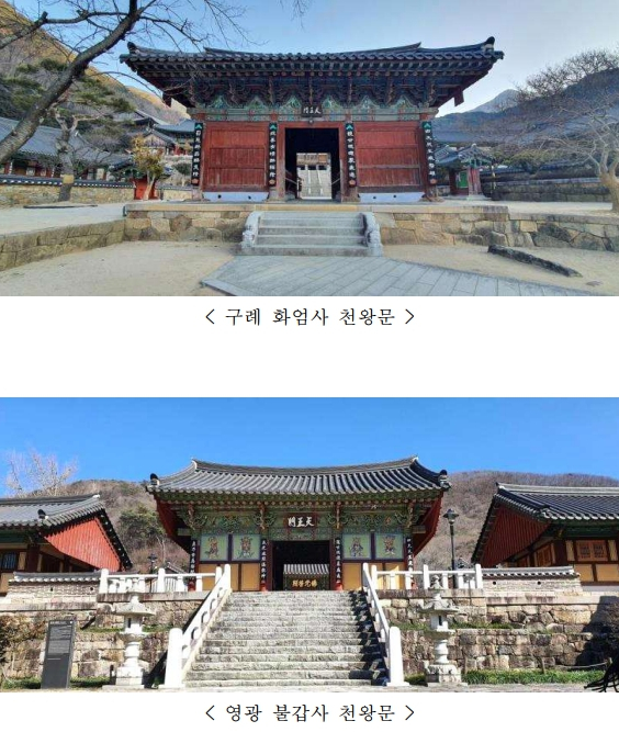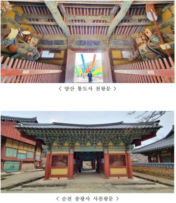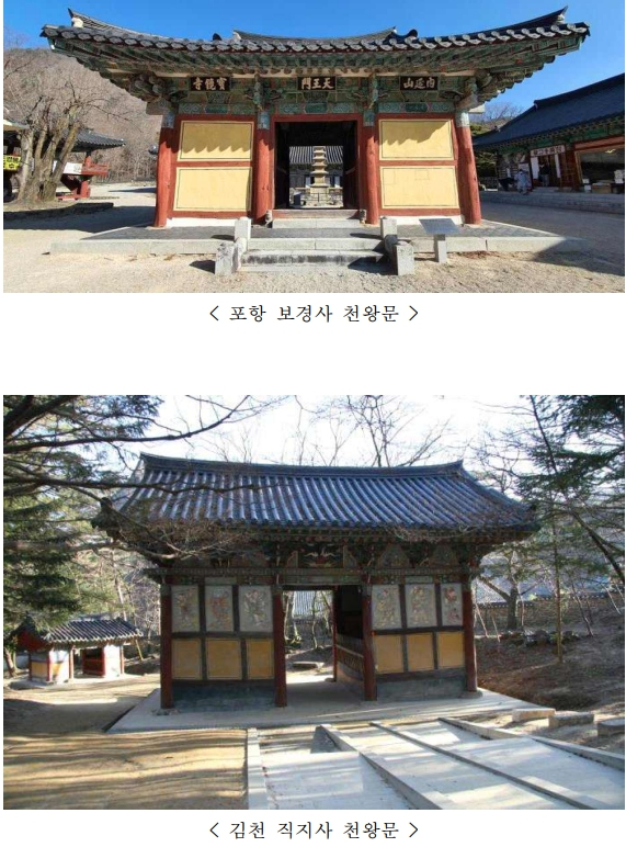또한, 「양산 통도사 천왕문(梁山 通度寺 天王門)」, 「영광 불갑사 천왕문(靈光 佛甲寺 天王門)」, 「포항 보경사 천왕문(浦項 寶鏡寺 天王門)」, 「김천 직지사 천왕문(金泉 直指寺 天王門)」은 조선 후기 건축양식의 변천과정을 확인할 수 있는 학술적 가치와 함께 지역적 특색을 간직하고 있는 사문(寺門)으로 역사적, 예술적인 가치가 크다.