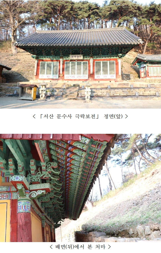 이번에 함께 보물로 지정된 「서산 문수사 극락보전(瑞山 文殊寺 極樂寶殿)」은 정면 3칸, 측면 3칸, 다포식 공포, 맞배지붕 형식의 불전으로 중건 시기에 대한 고증 자료는 없으나, 주요 구조부의 목재에 대한 연륜연대 조사와 방사성탄소연대 분석을 통해 1630년대에 중건(重建)된 것으로 파악된다.