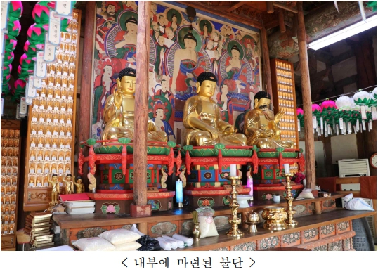 내부 중앙에 불상을 모시는 불단인 수미단을 두고 뒤쪽에 후불벽을 조성한 조선 중기 이전의 구성 양식을 갖는 등 17세기 중건 당시의 형식을 잘 간직하고 있어 건축학적 가치가 높다.