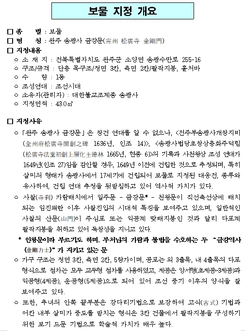 문화재청(청장 최응천)은 「완주 송광사 금강문(完州 松廣寺 金剛門)」 등 전국 사찰의 금강문(金剛門)과 천왕문(天王門) 8건과 불전인 「서산 문수사 극락보전(瑞山 文殊寺 極樂寶殿)」까지 총 9건을 국가지정문화유산 보물로 지정하였다.