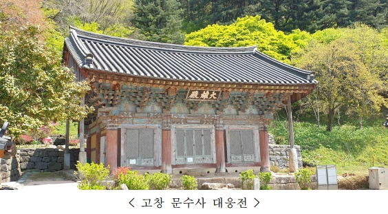 정면 3칸, 측면 2칸 규모인 「고창 문수사 대웅전」의 단순하면서도 강직한 공포의 형태와 짜임에는 조선 전기~중기에 이르는 양식과 전라도의 지역적 특색이 나타나 있다. 지붕은 4면에 공포가 배열된 팔작지붕의 형식을 갖추고 있었으나, 후대에 맞배지붕으로 그 형태가 변화함에 따라 현재는 다포계 맞배지붕의 기법과 양식을 충실하게 갖추고 있다. 또한, 단청에는 전통무기안료와 아교가 사용된 옛 기법이 남아 있어, 학술적·역사적 가치를 더하고 있다. * 공포: 처마의 무게를 받치려고 기둥머리에 짜 맞추어 댄 나무쪽 * 다포: 공포를 기둥 위와 기둥과 기둥 사이에도 꾸며 놓은 건축양식 * 팔작지붕 : 맞배지붕 옆에 삼각형의 합각을 남기고 경사를 지어 기와를 올리는 지붕 * 맞배지붕: 지붕면의 앞뒤로만 경사를 지어 기와를 올리는 지붕으로 옆에는 판재를 이어 붙여서 비바람을 막음
