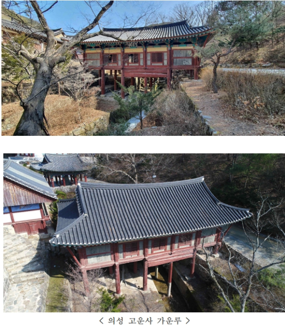 | 한편, 의성 고운사는 의상대사에 의해 신라시대 때 창건된 사찰로 전해지며, 「의성 고운사 가운루」는 「고운사사적비(孤雲寺事蹟碑, 1729년)」, 「고운사사적비(孤雲寺事蹟碑, 1918년)」 등의 문헌사료를 통해 1668년에 건립되었음을 확인할 수 있다.