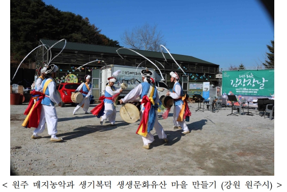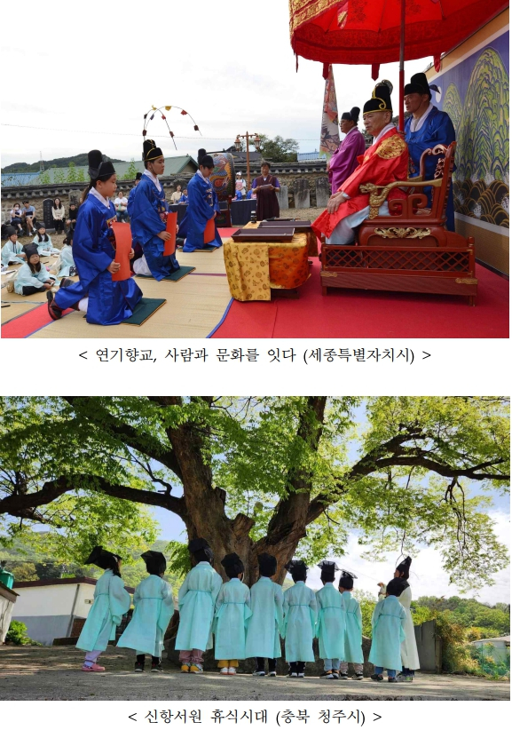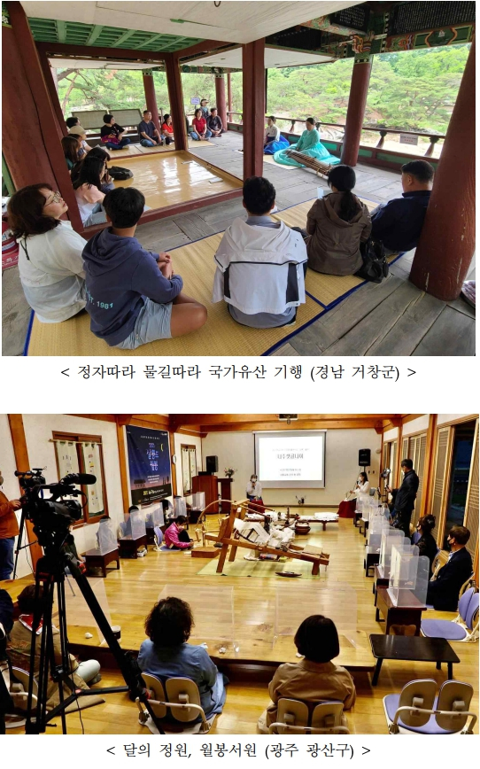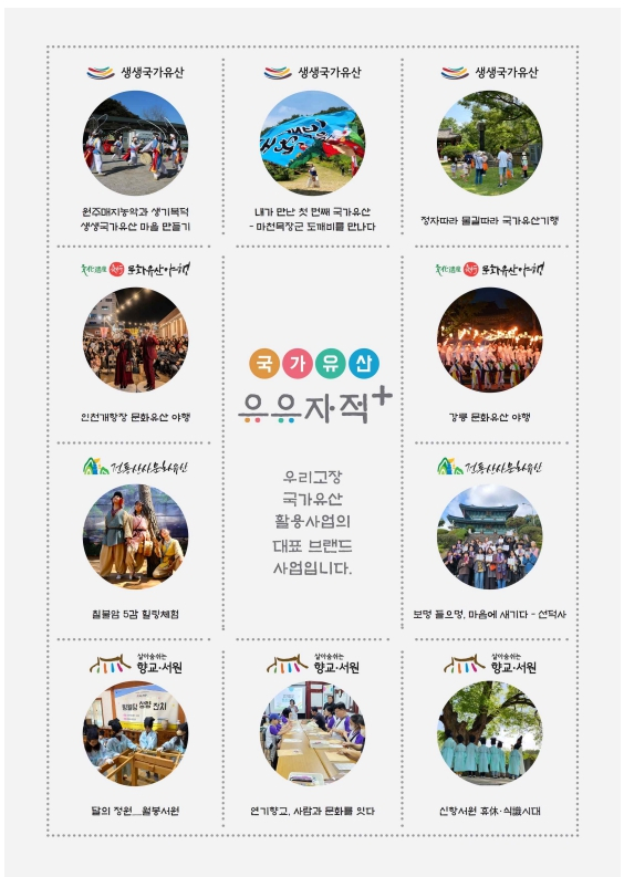 | 지역에 소재한 국가유산의 가치와 의미를 발견해 지역의 대표 관광자원이 되도록 지원하는 ‘생생국가유산’ 사업에서는 ▲ 도 무형유산인 ‘원주매지농악’ 전수관을 거점으로 다양한 공연과 회촌마을 이틀살기 등의 프로그램을 담은 「원주 매지농악과 생기복덕 생생문화유산 마을 만들기」(강원 원주시), ▲ 보물인 ‘마천목 좌명공식녹권’과 도깨비 설화를 인형극과 체험을 통해 친숙하게 기획한 「섬진강 도깨비마을」(전남 곡성군), ▲ 자연유산인 명승 ‘거창 수승대’를 비롯해 정자문화와 선비문화의 가치를 알리는 「정자따라 물길따라 국가유산 기행」(경남 거창군)이 선정되었다. 향교·서원을 생기 넘치는 문화공간이자 청소년 인성 함양 공간으로 조성하는 ‘살아숨쉬는 향교·서원’ 사업에서도 3건이 대표사업으로 선정됐다. ▲ 조선 성리학과 월봉서원을 현대적으로 재해석한 ‘선비의 하루’, ‘살롱드월봉’ 등의 프로그램을 제공하는 「달의 정원, 월봉서원」(광주 광산구), ▲ 시 기념물인 ‘연기향교’에서 자연과 전통문화를 함께 즐기며 기후변화 대응 실천방안을 모색하는 「연기향교, 사람과 문화를 잇다」(세종특별자치시), ▲ 현대적 감각에 맞는 인문교육과 체험 프로그램을 통해, 도 기념물인 ‘신항서원’의 옛 가치를 이어가는 「신항서원 휴식시대」(충북 청주시) 사업 등 3건이다.