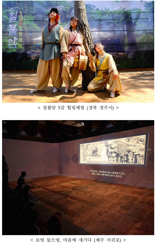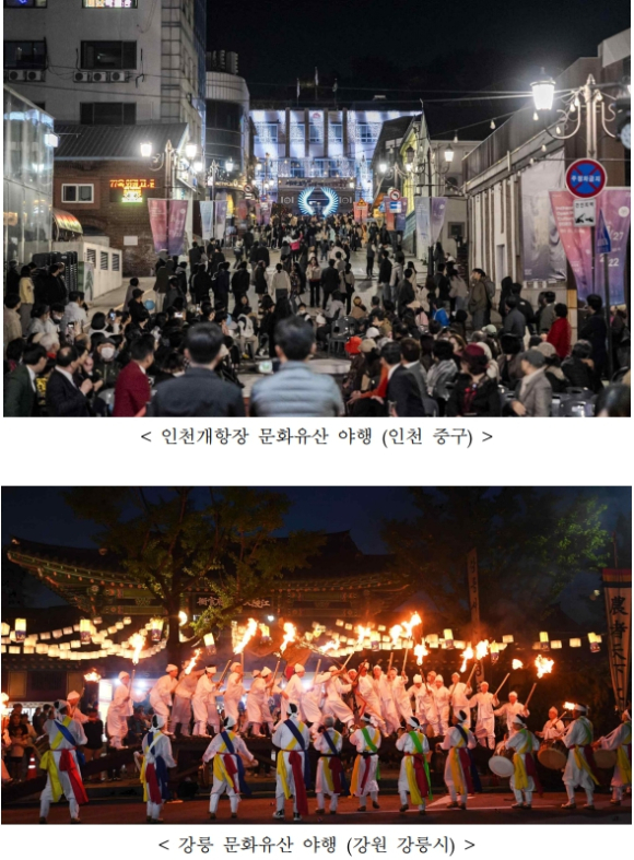 | 밤에 즐기는 ‘문화유산 야행’ 사업에서는 ▲ 인천개항장의 가치와 의미를 알려 대표적인 야간관광 명소로 발돋움하고 있는 「인천개항장 문화유산 야행」(인천 중구), ▲ 사적 ‘강릉대도호부 관아’ 일대를 중심으로 다양한 역사문화체험 기회를 제공하는 「강릉 문화유산 야행」(강원 강릉시) 사업이 선정됐다. 지역에 있는 ‘전통산사 문화유산 활용’ 사업으로는 ▲ 보물인 ‘경주 남산 신선암 마애보살반가상’과 함께 남산을 활동 무대로 신라 이전부터 현대에 이르기까지 문화유산이 주는 의미를 오감 치유(힐링) 주제로 풀어보는 「칠불암 5감 힐링체험」(경북 경주시), ▲ 묘법연화경을 현대적으로 재해석하고, 정보통신 기술(ICT) 실감 콘텐츠 체험 기회를 제공하는 「보멍 들으멍, 마음에 새기다」(제주 서귀포) 사업이 선정됐다.