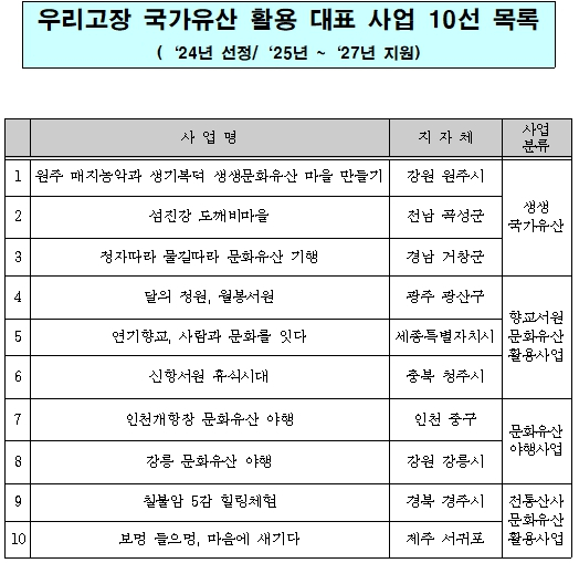 문화재청(청장 최응천)은 ‘우리고장 국가유산 활용사업’ 중에서 2025년부터 3년간의 다년도 지원을 받을 수 있는 ‘대표 사업’ 10건을 선정했다.