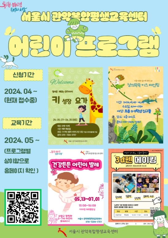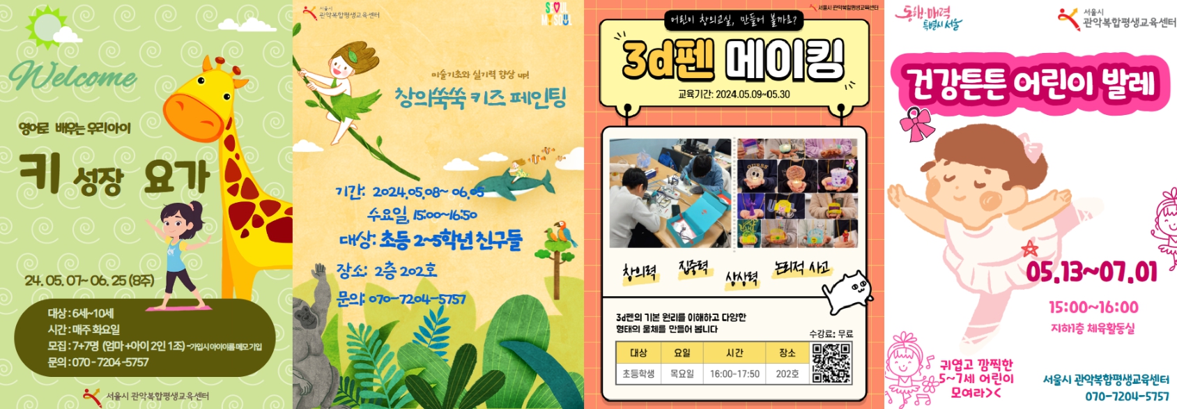서울시 관악복합평생교육센터(이하, 센터)는 서울시 관악구 낙성대로 70에 위치한 평생학습의 열린배움터로서 서울시민의 공공복리 증진을 위한 다양한 평생교육 프로그램을 운영하고 있다. 5월에 어린이 문화예술 강좌가 열린다.